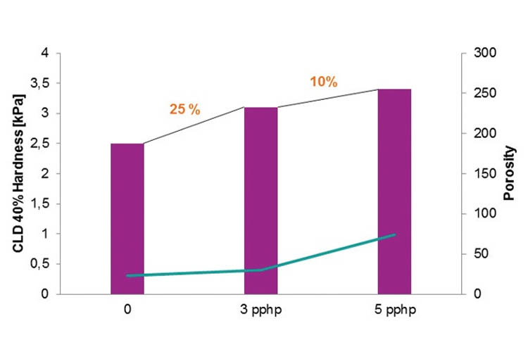 如圖1所示,在參考配方實(shí)驗(yàn)室條件下,密度為16kg/m3海綿中添加3pphp和5pphp 的nt add h18,其硬度增加達(dá)到25%和35%。
