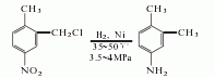 2、其制備方法是以對(duì)硝基甲苯為原料進(jìn)行氯甲基化再加氫還原脫氯而制得。在反應(yīng)釜內(nèi)加入二氯甲醚、對(duì)硝基甲苯、氯磺酸,于15~20℃攪拌反應(yīng)后,再經(jīng)水解、過(guò)濾,濾餅洗滌得2-氯甲基-4-硝基甲苯,將2-氯甲基-4-硝基甲苯溶于乙醇中,加蘭尼鎳,先通氮?dú)馊〈磻?yīng)器內(nèi)的空氣,然后通氫氣,控制溫度35~50℃,壓力3.4~3.9 mpa,通氫氣完畢,蒸餾回收乙醇后,加氫氧化鈉堿化,再以水蒸氣蒸餾得成品。