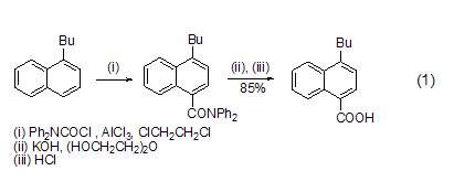 羧基的引入  在alcl3催化下,dpc-cl 可在芳環(huán)上引入一個(gè)羧基。烷基或烷氧基取代的芳環(huán)容易發(fā)生反應(yīng)。產(chǎn)物二苯基酰胺用堿水解,再酸化可得到羧酸 (式1)[1]